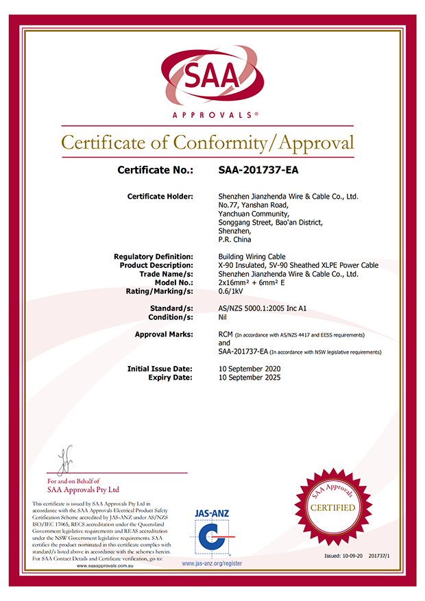 深圳建圳達(dá)電線電纜有限公司,成立于2000年,是一家電線電纜制造商,我們通過了世界各地不同市場的多數(shù)認(rèn)證,如:CCC、RoHS、CB、SAA、TUV、VDE、PSE、BPS、UL、CSA。我們根據(jù)定制產(chǎn)品不斷更新新的認(rèn)證。經(jīng)過數(shù)十年的發(fā)展,我們與來自世界各地的客戶建立了長期的合作關(guān)系。我們曾經(jīng)是菲律賓機(jī)場,,柬埔寨的電力站,美國的醫(yī)院,工廠,埃塞俄比亞的水電站項(xiàng)目。我們是一家值得信賴的電線供應(yīng)商。